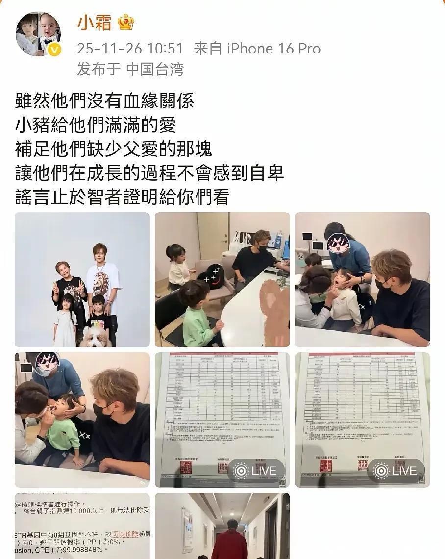 这剧情真的又清白又混乱:说没关系吧,他对孩子掏心掏肺还留遗产;说有关系吧,亲子鉴定锤得死死的;说要结婚吧,最后又怕对小霜家庭不公平放弃了~ 网友都笑称他是“父爱管理大师”,别人辟谣靠律师函,他靠亲子鉴定+顶级干爹待遇,直接把瓜玩出新高度!